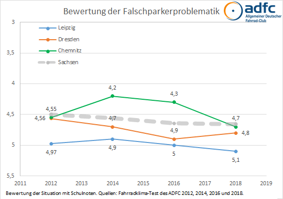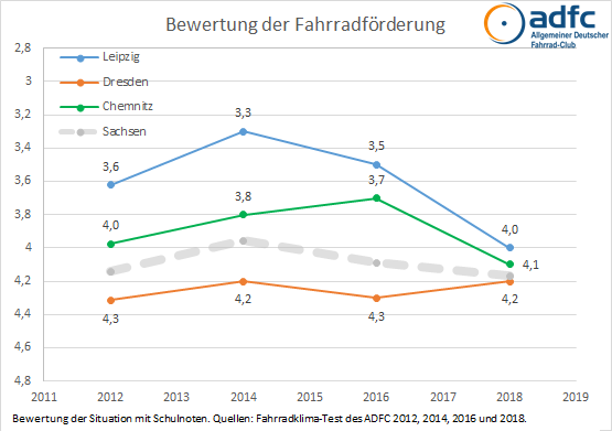 Im Herbst 2018 bewerteten in Dresden bei der Umfrage 2.800 Personen ihre Stadt nach Fahrradkriterien, deutschlandweit waren es rund 170.000. 74% der Befragten nutzen täglich das Rad, allerdings sind nur 15% von ihnen Mitglied im ADFC. Gleichzeitig fahren mehr als drei Viertel der Befragten regelmäßig Auto als auch Fahrrad und kennen somit beide Perspektiven. Mit einer Gesamtbewertung der Fahrradsituation von 3,96 liegt Dresden im bundesweiten Mittelfeld, allerdings deutlich abgeschlagen hinter dem Spitzenreiter Bremen (3,55) und auch Leipzig (3,85).