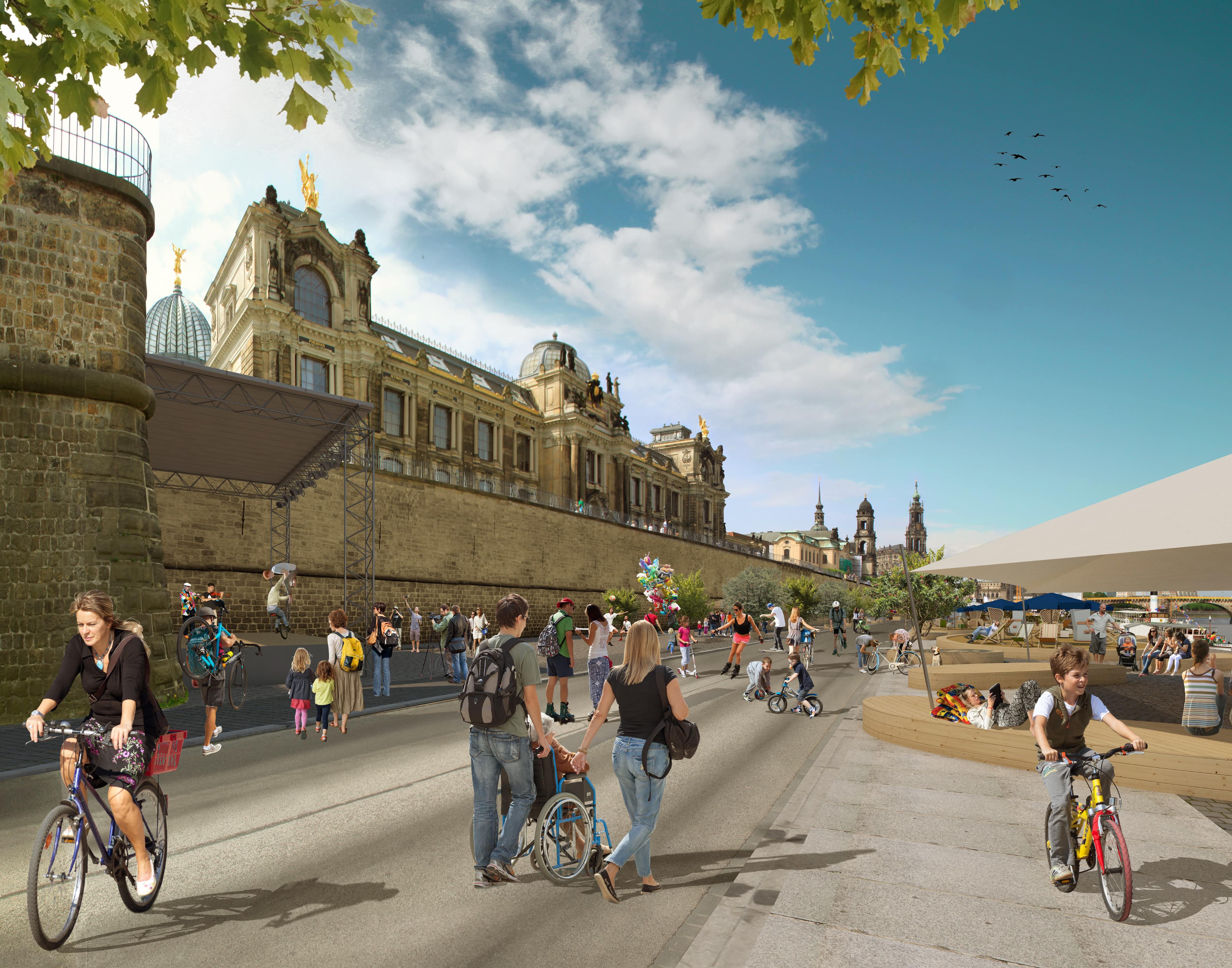 Der ADFC Dresden schlägt deshalb vor, den Kfz-Verkehr während der Sommerferien umzuleiten, so dass das Terrassenufer in dieser Zeit vollständig Fußgängern und Radfahrern zur Verfügung steht. Dieser Idee des ADFC, das Terrassenufer zu einer temporären Flaniermeile umzugestalten, stehen die meisten Teilnehmer der Umfrage aufgeschlossen gegenüber. „Dresdnerinnen und Dresdner wünschen sich mehr Grün, weniger Kfz-Verkehr und lebendige Straßen mit Platz für Kultur- und Freizeitangebote“, so Nils Larsen, Mitglied des Vorstandes des ADFC Dresden. „Die Sommerferien sind der perfekte Zeitpunkt, um all dies am Terrassenufer umzusetzen." Der ADFC will die Straße unterhalb des „Balkons Europas“ in ihrer vollen Pracht aufleben lassen. In einer Visualisierung zeigt der Fahrradclub, wie dies praktisch aussehen kann.