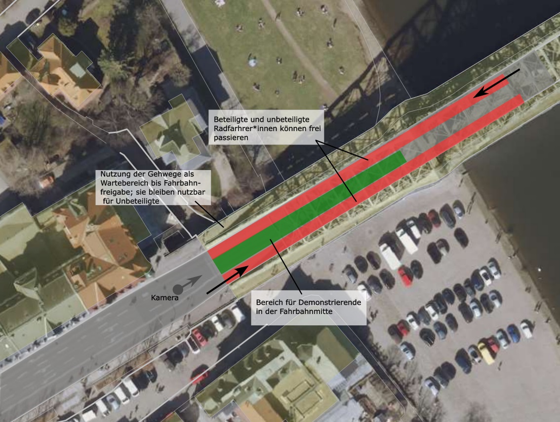 Bitte kommt am Montag vorbei und unterstützt unsere Forderung! Bringt gern Plakate mit und eure Nachbarn. Bitte informiert euch kurzfristig auf dieser Seite über mögliche Änderungen kurz vor der Demo. Bis zur Freigabe der Fahrbahn durch die Polizei versammeln wir uns auf beiden Gehwegen der Brücke, aber so, dass diese für Unbeteiligte noch nutzbar bleiben (siehe Skizze)