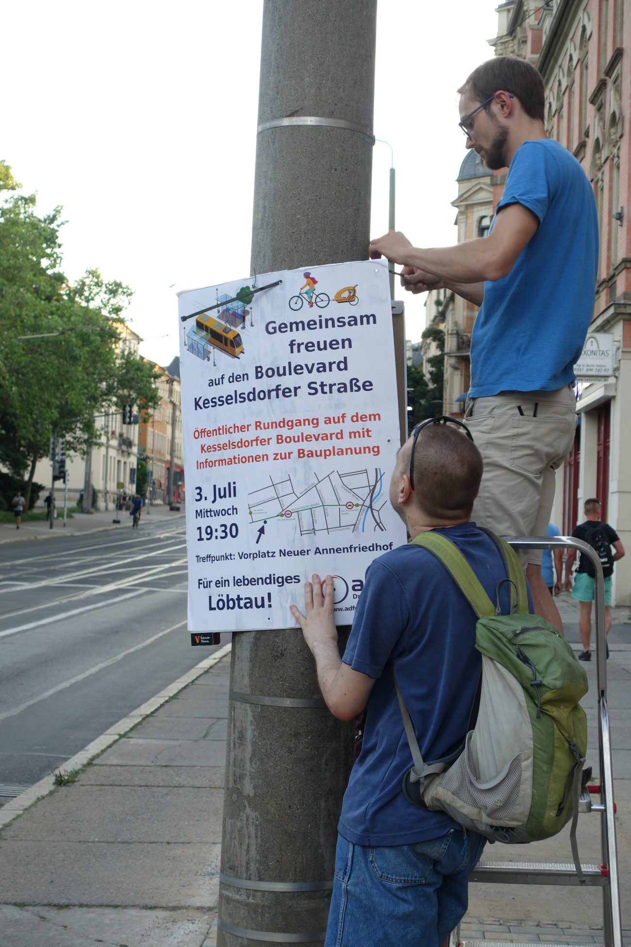 Wenn man Menschen in Löbtau fragt, was sie über den neuen Boulevard auf der Kesselsdorfer Straße wissen, erhält man einen bunten Strauß an Antworten. Nur eines ist sicher: Die Bauarbeiten gehen voran und die Vorfreude auf das Ergebnis wächst. Doch wann die Arbeiten fertig werden, was genau gebaut wird und was auf der Strecke bleibt, ist oft nicht bekannt. Manche meinen es wird eine durchgängige Fußgängerzone zwischen den Haltestellen Bünaustraße und Tharandter Straße geben. Andere hoffen, dass der Boulevard bis zum Semesterbeginn fertig wird. Was stimmt? Das Stadtplanungsamt bemüht sich die Einheimischen auf dem Laufenden zu halten und in die Planungen einzubeziehen. Zuletzt bei einer Bürgerwerkstatt zur Gestaltung der Kesselsdorfer Straße Anfang Juni. Der ADFC begrüßt solche Angebote und möchte einen eigenen Beitrag leisten.