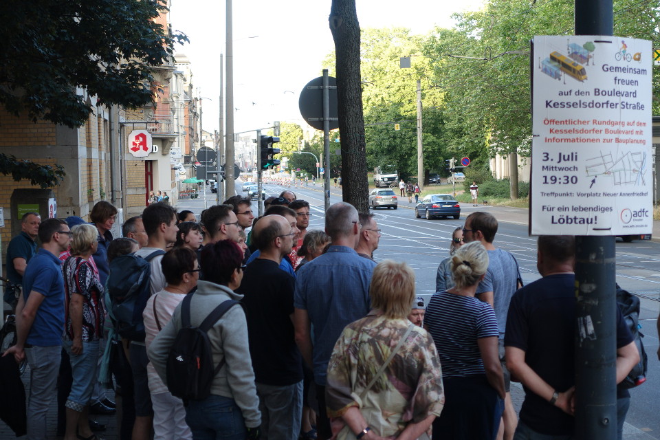 Unter dem Motto „Gemeinsam freuen auf den Boulevard Kesselsdorfer Straße - Für ein lebendiges Löbtau“ führten am 3. Juli Aktive der ADFC-Stadtteilgruppe Löbtau/DD-West interessierte Anwohner über den geplanten zweiten Bauabschnitt der Kesselsdorfer Straße (zwischen Reisewitzer und Rudolf-Renner-Straße). Ziel war es, den Planungsstand vor Ort zu erläutern, aus ADFC-Sicht zu bewerten und Meinungen der Bürger aufzunehmen. Etwa 60 Interessierte nahmen an dem Rundgang teil. ADFC-Aktiver Matthias Lieber begrüßt die Teilnehmer mit einigen Fragen: Wer fährt mehrmals in der Woche Fahrrad auf der „Kellei“, wer ist hier zu Fuß oder mit dem Auto unterwegs? ADFC-Aktiver Kilian Gebhardt erklärt: „Die Bauarbeiten im Bereich zwischen Reisewitzer Straße und der Einmündung der Wernerstraße sind nur provisorischer Natur. Ab Herbst werden hier wieder Autos fahren dürfen. Die Haltestelle Bünaustraße wird erst bei Realisierung des zweiten Bauabschnittes für den Kfz-Verkehr gesperrt werden.“ Der Spaziergang führt vom Neuen Annenfriedhof bis zur Poststraße und dann auf der Nordseite weiter bis hinter die Rudolf-Renner-Straße, wo der dritte Bauabschnitt beginnt. Unterwegs erläutern Aktive der Stadtteilgruppe den Stand der Planungen. Kilian Gebhardt betont: „Für den zweiten Bauabschnitt hatte der ADFC Dresden gefordert, dass der Seitenraum so dimensioniert wird, dass wirklich von einem Boulevard die Rede sein kann. Leider hat der Stadtrat sich anders entschieden. Für die noch offene Ausgestaltung des Seitenraums fordern wir deutlich mehr Fahrradstellplätze als bisher.“