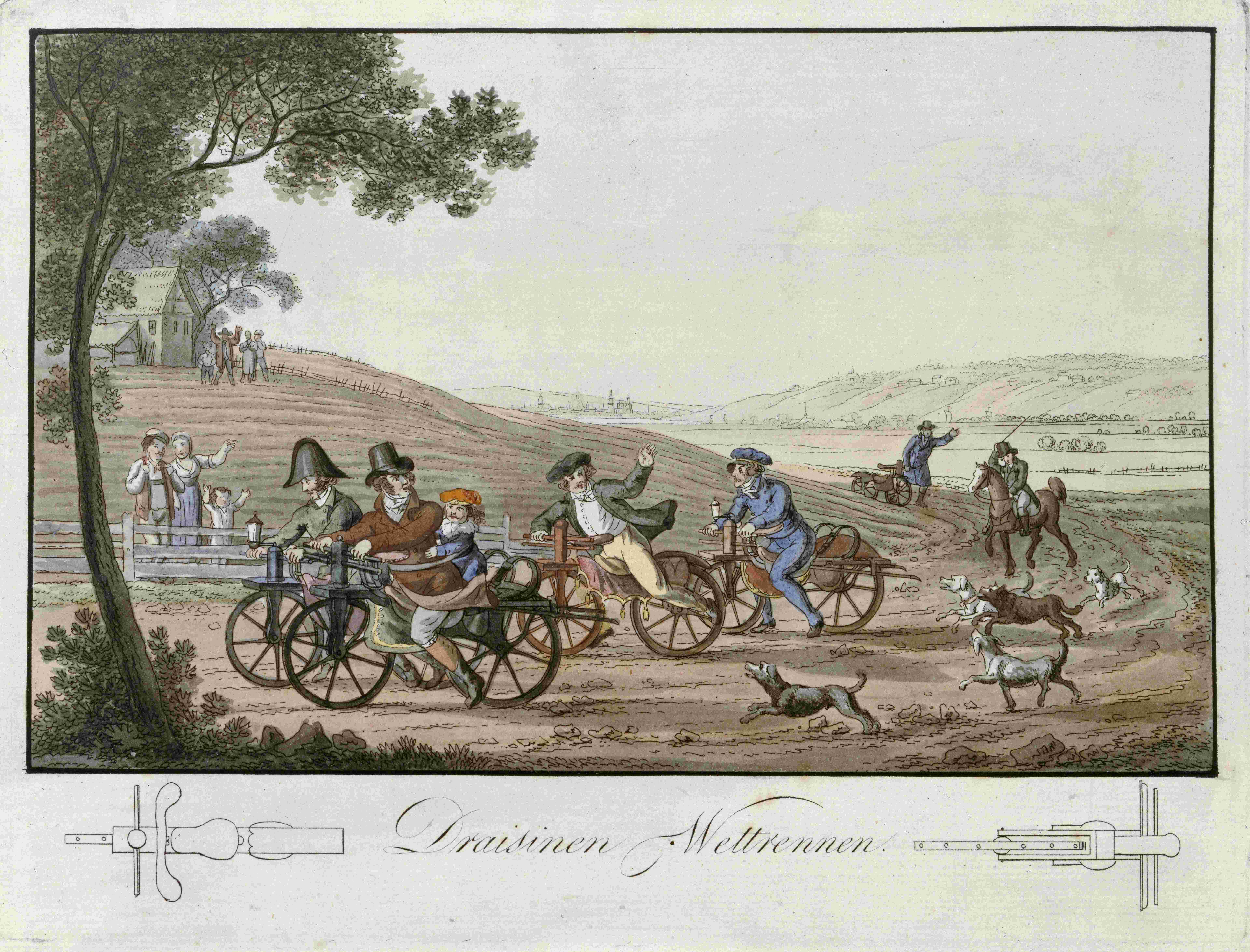 Spätestens im Mai 1818 ist Bertholdy sogar von Dresden nach Leipzig gefahren und hat die Strecke, die "dreyzehn deutsche Postmeilen beträgt, in sieben Stunden zurückgelegt" [2]. Der abgebildete Kupferstich mit dem Untertitel "Draisinen-Wettrennen", der eindeutig die Stadtsilhouette von Dresden erkennen lässt, illustriert wahrscheinlich genau diese, über die Grenzen der Stadt bekannt gewordene Fahrt. Das Bild zeigt auch, dass schon am Anfang des 19. Jahrhunderts der Kindertransport mit dem Fahrrad ein Thema war.