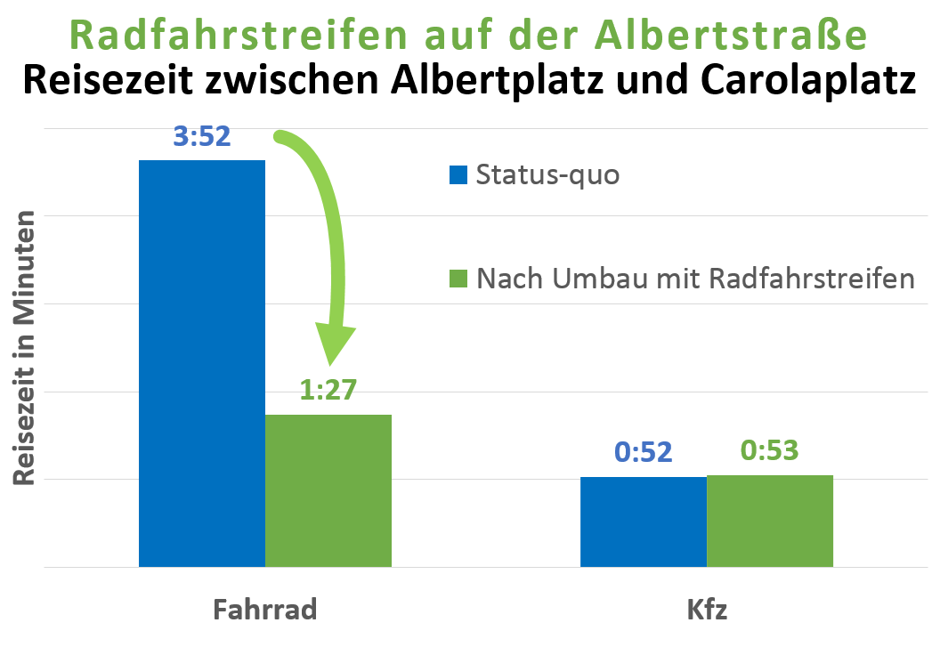 Eine Untersuchung des ADFC Dresden zeigt, dass die Anlage von Radfahrstreifen auf der Albertstraße zu einer Zeitersparnis von zweieinhalb Minuten für den Radverkehr führen. Dem steht eine Sekunde Zeiteinbuße für den Autoverkehr entgegen. Der Bau eines Radstreifens auf der Albertstraße würde somit dazu führen, dass Radfahrende zwischen Albert- und Carolaplatz statt in 3:52 Minuten nur noch 1:27 Minute pro Fahrt benötigen würden.