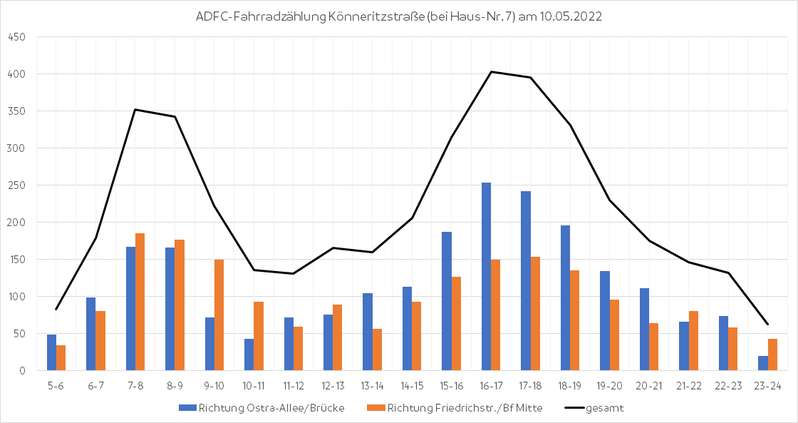 Anmerkung: Orientiert an den Verkehrszählungen der Stadt haben im Mai Ehrenamtliche des ADFC Dresden an einem Werktag in der Mitte der Woche von 5 bis 24 Uhr in Viertelstunden-Segmenten gezählt. Der Monat Mai gilt neben dem September bei Verkehrszählungen als klassischer Normalmonat.