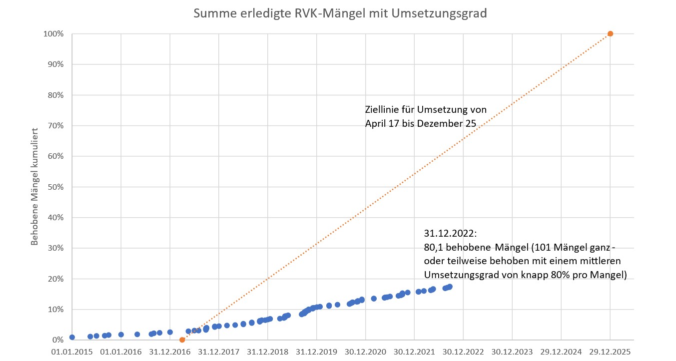 Im Jahr 2021 wurden 10,3 Maßnahmen aus dem Konzept erledigt (es waren 13 Maßnahmen, nicht alle Mängel wurden aber vollständig behoben) und im vergangenen Jahr wurden 11,1 Maßnahmen erledigt. Glaubt man den Ankündigungen, sollen 2023 ca. 14-15 Mängelbehebungen des Konzepts Realität werden. Auch wenn sich bei der Baustelle Radverkehrskonzept also die Bilanz leicht bessert, eine völlige Umsetzung bis 2025, wie ursprünglich gedacht, ist nicht mehr zu schaffen.