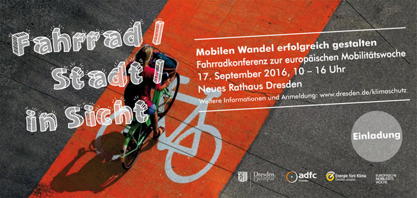 Wie sieht das in Dresden aus? Was fehlt, welche Möglichkeiten gibt es und wie könnten konkrete Projekte auf dem Weg zur Fahrradstadt Dresden aussehen? Darauf sucht die Fahrradkonferenz Fahrrad / Stadt / in Sicht nach Antworten, zu der Sie ADFC und Landeshauptstadt Dresden am 17. September herzlich einladen.