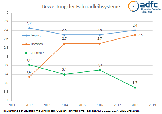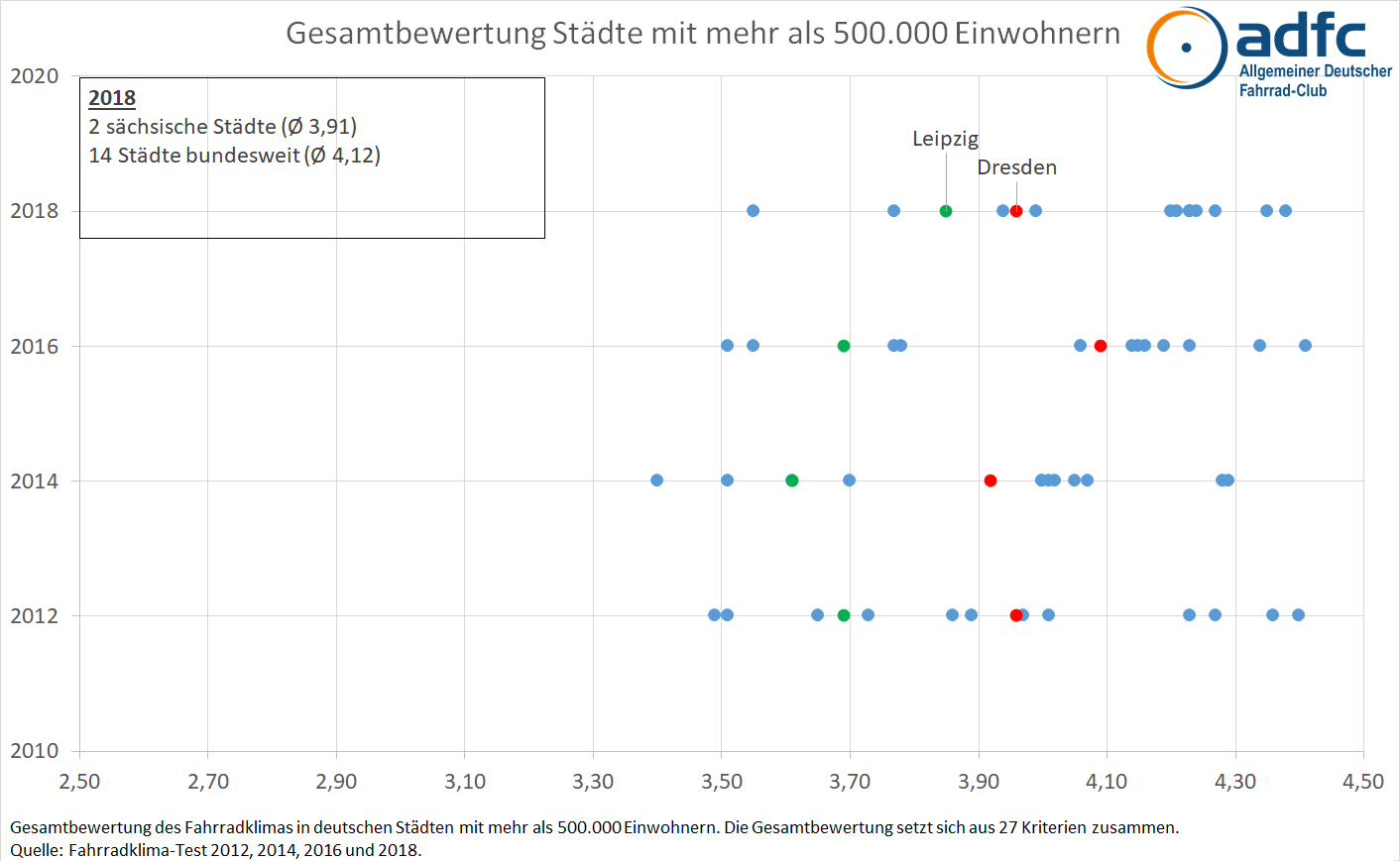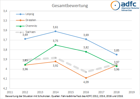 Im Herbst 2018 bewerteten in Dresden bei der Umfrage 2.800 Personen ihre Stadt nach Fahrradkriterien, deutschlandweit waren es rund 170.000. 74% der Befragten nutzen täglich das Rad, allerdings sind nur 15% von ihnen Mitglied im ADFC. Gleichzeitig fahren mehr als drei Viertel der Befragten regelmäßig Auto als auch Fahrrad und kennen somit beide Perspektiven. Mit einer Gesamtbewertung der Fahrradsituation von 3,96 liegt Dresden im bundesweiten Mittelfeld, allerdings deutlich abgeschlagen hinter dem Spitzenreiter Bremen (3,55) und auch Leipzig (3,85).