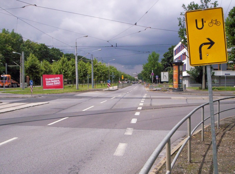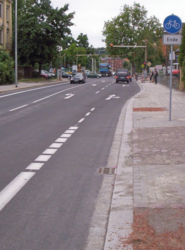 Die Tharandter Straße im Abschnitt zwischen Reisewitzer und Schillingstraße wurde am Montag (14.07.08) dem Verkehr übergeben. Die ursprünglichen Planungen sahen hier mit einigen kleinen Ausnahmen an Bushaltestellen und Bereichen mit dichten Kreuzungsfolgen fast aussschließlich klassische Hochbordradwege vor, auf denen aufgrund der geplanten Mindestbreite von 1,50 m nicht einmal Überholvorgänge zwischen Radfahrern möglich gewesen wären.