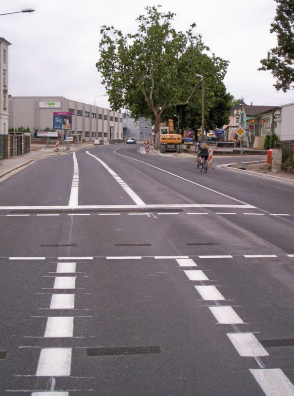 Diese Planungen wurden zum Glück noch gründlich überarbeitet! Zur Ausführung kamen nun fast durchgängig Radfahrstreifen. Lediglich an den Standorten der verbliebenen Alleebäume wurde dieser zugunsten eines verbreiterten Wurzelraums für die Altbäume auf